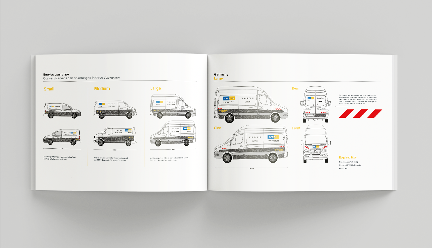 Over several months I worked closely with Swecon to create a comprehensive guideline system for the branding, striping and wrapping of their service vehicle fleet across Northern Europe. The project focused on translating brand identity into clear, production-ready rules that could be used by external partners, local production firms and regional teams.